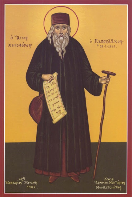 Ο Χριστόφορος Παναγιωτόπουλος (Παπουλάκος) γεννήθηκε στα χρόνια μεταξύ 1790-1795 στο χωριό Άρμπουνα των Καλαβρύτων. Από μικρός ασχολήθηκε βιοποριστικά με τη σφαγή κρεάτων. Έμαθε λίγα γράμματα, ανάγνωση και γραφή αυτοδίδακτος, καθώς δεν περίσσευε χρόνος για περισσότερες ασχολίες. Σε ώριμη ηλικία, έκτισε με πενιχρά μέσα ένα ησυχαστήριο και ασκήτευσε ως μοναχός σε αυτό, επιδιδόμενος σε προσευχητικά γυμνάσματα και καλλιεργώντας την ¨εν Χριστώ ησυχία¨, την εγκράτεια και την αποκοπή του ιδίου θελήματος. Με την πάροδο του χρόνου, άλλοτε αυτόκλητος και άλλοτε προσκεκλημένος, περιόδευε αρχικά στα χωριά της Αχαΐας και αργότερα και σε άλλους νομούς και δίδασκε το ιερό Ευαγγέλιο, την ορθόπρακτη αγάπη προς όλους και την ελεημοσύνη(2).