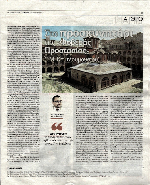 "Στο προσκυνητάρι της Φοβεράς Προστασίας". Νέο άρθρο του Δημητρίου Π. Λυκούδη στην έντυπη εφημερίδα "Κιβωτός της Ορθοδοξίας" [13/10/2016]