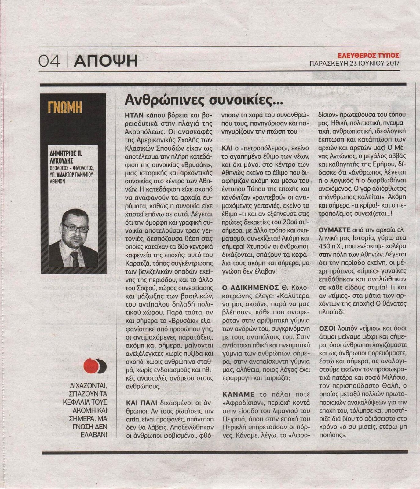 "Ανθρώπινες Συνοικίες". Νέα δημοσίευση του Δημητρίου Π. Λυκούδη στην έντυπη εφημερίδα "Ελεύθερος Τύπος" [23/06/2017]