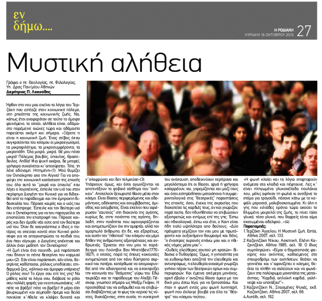 Άρθρο του Δημητρίου Π. Λυκούδη στην έντυπη εφημερίδα "Η Ροδιακή" (16/10/2016), με τίτλο "Μυστική αλήθεια"