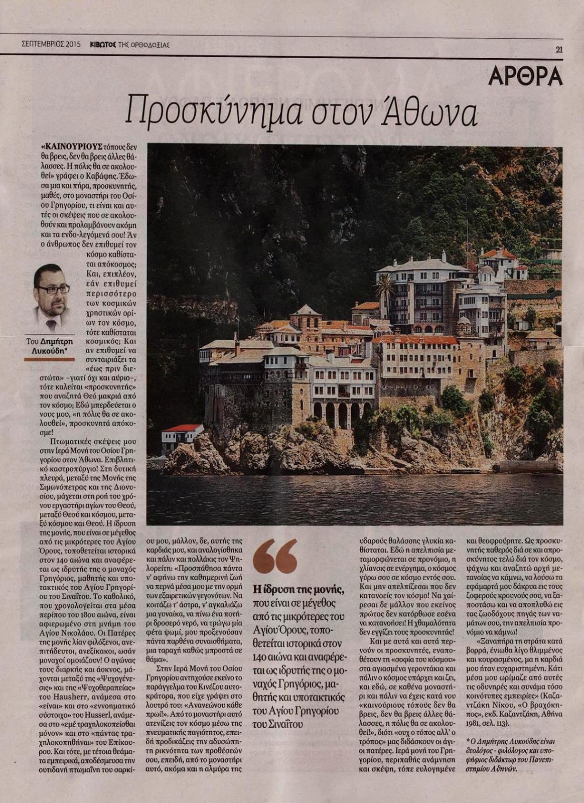 Νέο άρθρο του Δημητρίου Π. Λυκούδη στην έντυπη εφημερίδα "Κιβωτός της Ορθοδοξίας" με θέμα: "Προσκύνημα στον ΄Αθωνα"