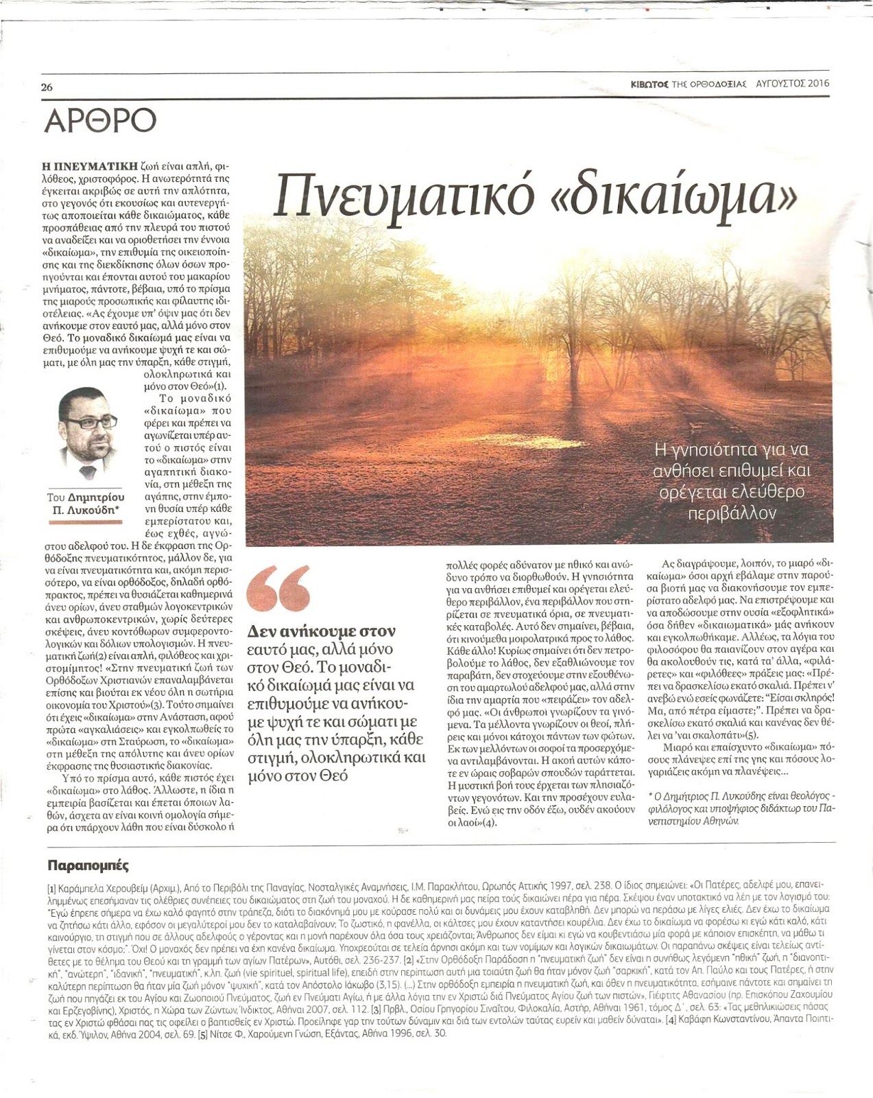 Νέο άρθρο του Δημητρίου Π. Λυκούδη στην έντυπη εφημερίδα "Κιβωτός της Ορθοδοξίας" [04/08/2016]