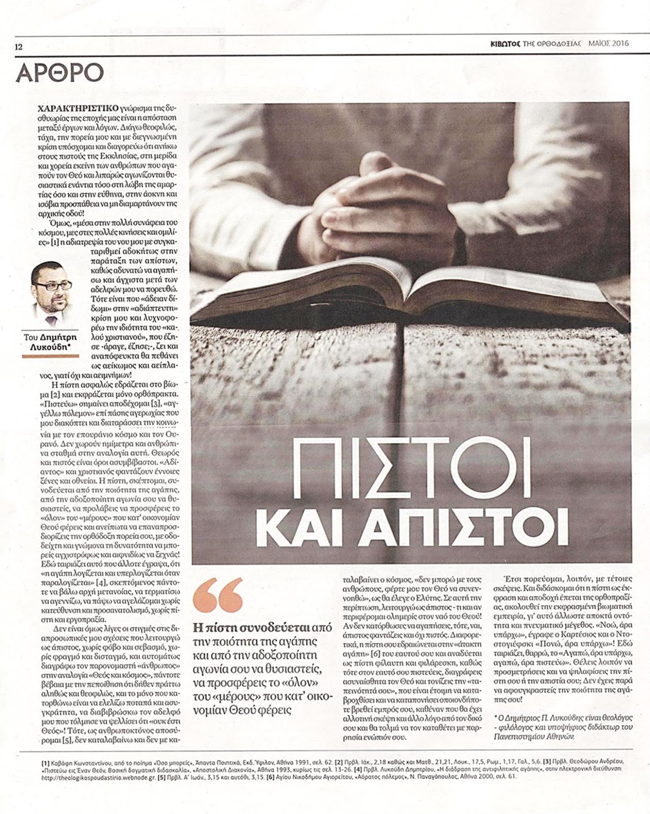 Νέο άρθρο του Δημητρίου Π. Λυκούδη στην έντυπη εφημερίδα "Κιβωτός της Ορθοδοξίας" [12/05/2016]