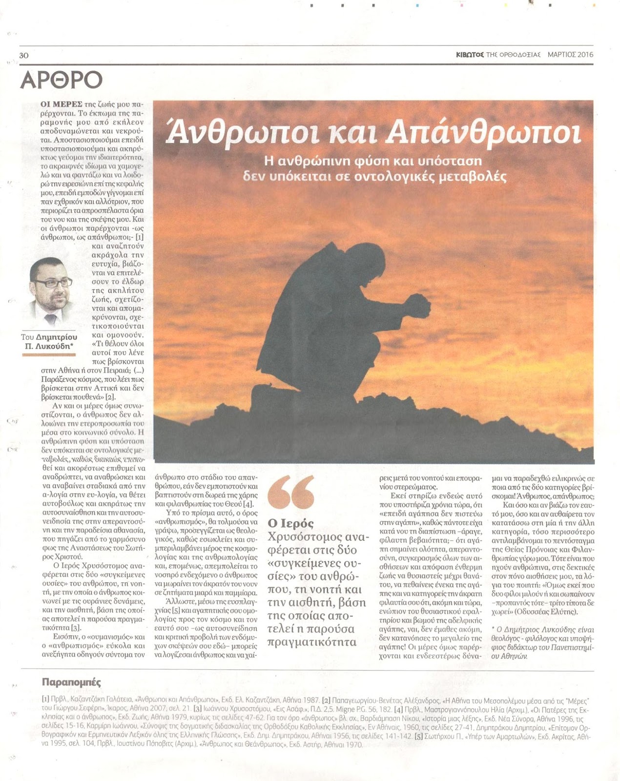 Νέο άρθρο του Δημητρίου Π. Λυκούδη στην έντυπη εφημερίδα "Κιβωτός της Ορθοδοξίας" [17/03/2016]