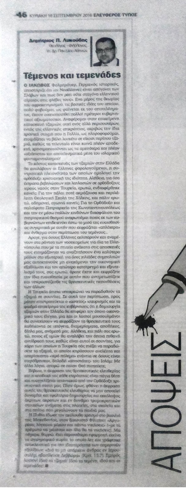 "Τέμενος και τεμενάδες" είναι ο τίτλος του νέου άρθρου του Δημητρίου Π. Λυκούδη στην έντυπη εφημερίδα της Κυριακής ΕΛΕΥΘΕΡΟΣ ΤΥΠΟΣ, αρ. φύλ. 356, Κυριακή 18 Σεπτεμβρίου 2016, 46.